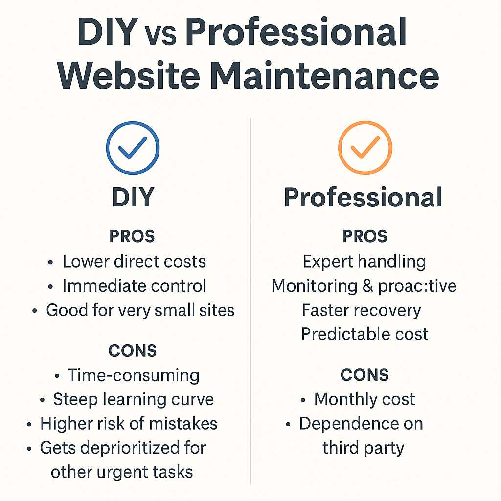 The question isn’t whether your site needs maintenance (it does). The real question is: should you do it yourself, or hire a professional? Let’s break down both options.