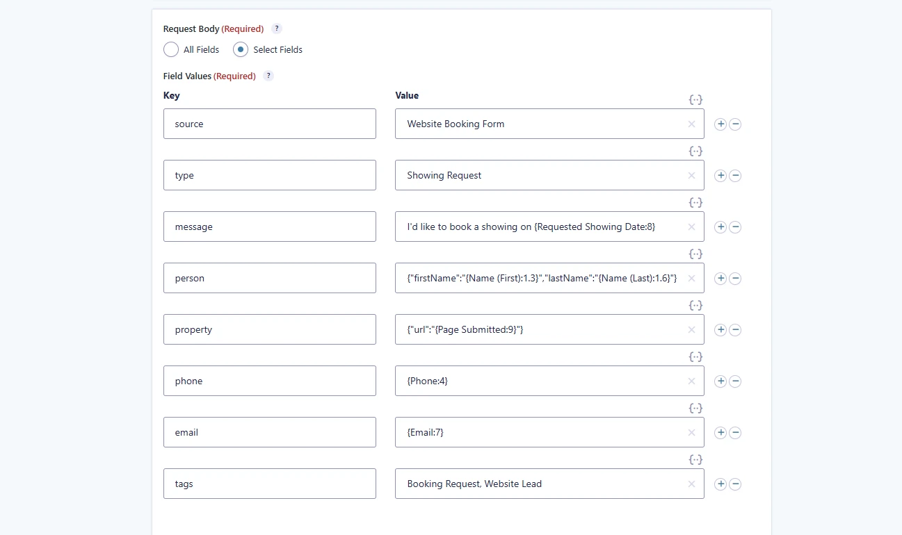GUI-Driven Setup: Each form was configured in the Gravity Forms Webhooks UI. Field mappings cover source, type, message, person, property, email, phone, and tags. No PHP per form needed.