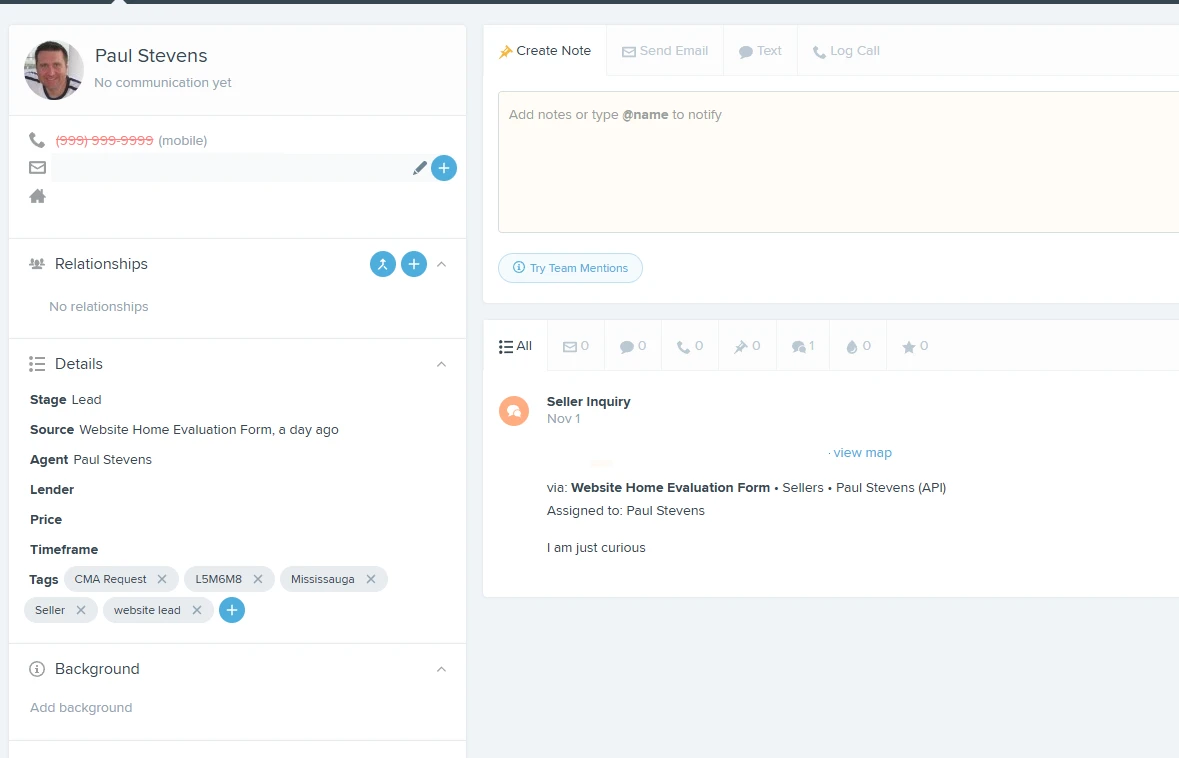 Contacts are automatically created or updated in Follow Up Boss, and events (e.g., “General Inquiry”, “Seller Inquiry”) get logged on the contact’s timeline.