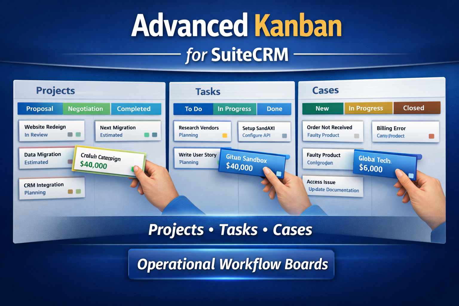 The iGo Advanced Kanban for SuiteCRM introduces visual workflow boards that allow teams to manage operational work the same way modern teams manage development or project workflows.