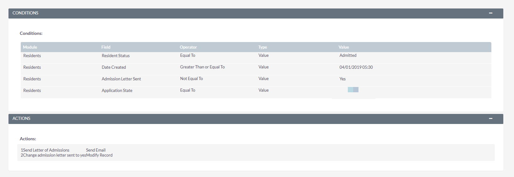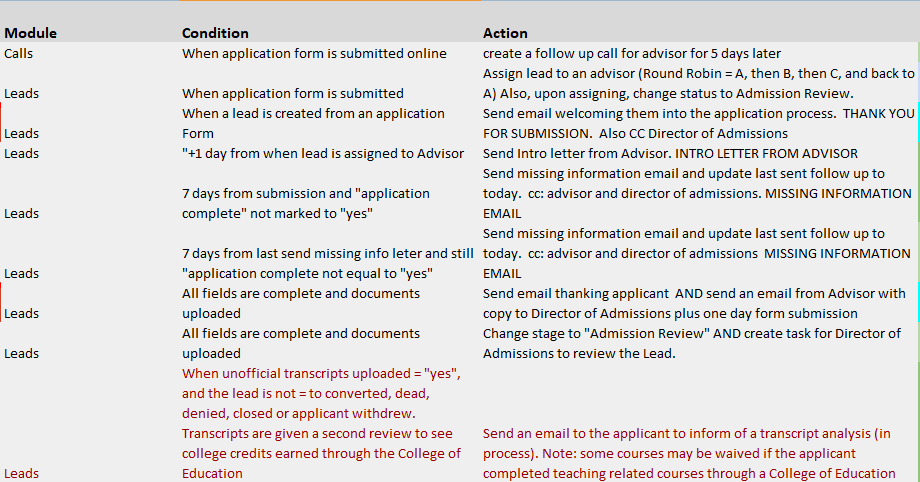Here’s an example of an admissions workflow that updates the record and sends the admissions letter.
